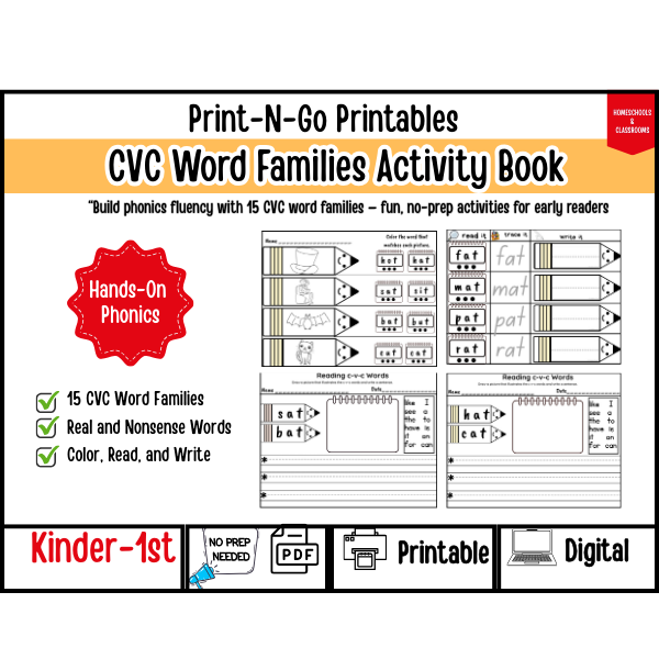 CVC Word Families Activity Book | 62 pgs |Downloadable PDF| Prek-K - $5.00